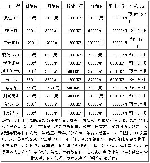 泰安首汽租賃公司租賃車輛報價表